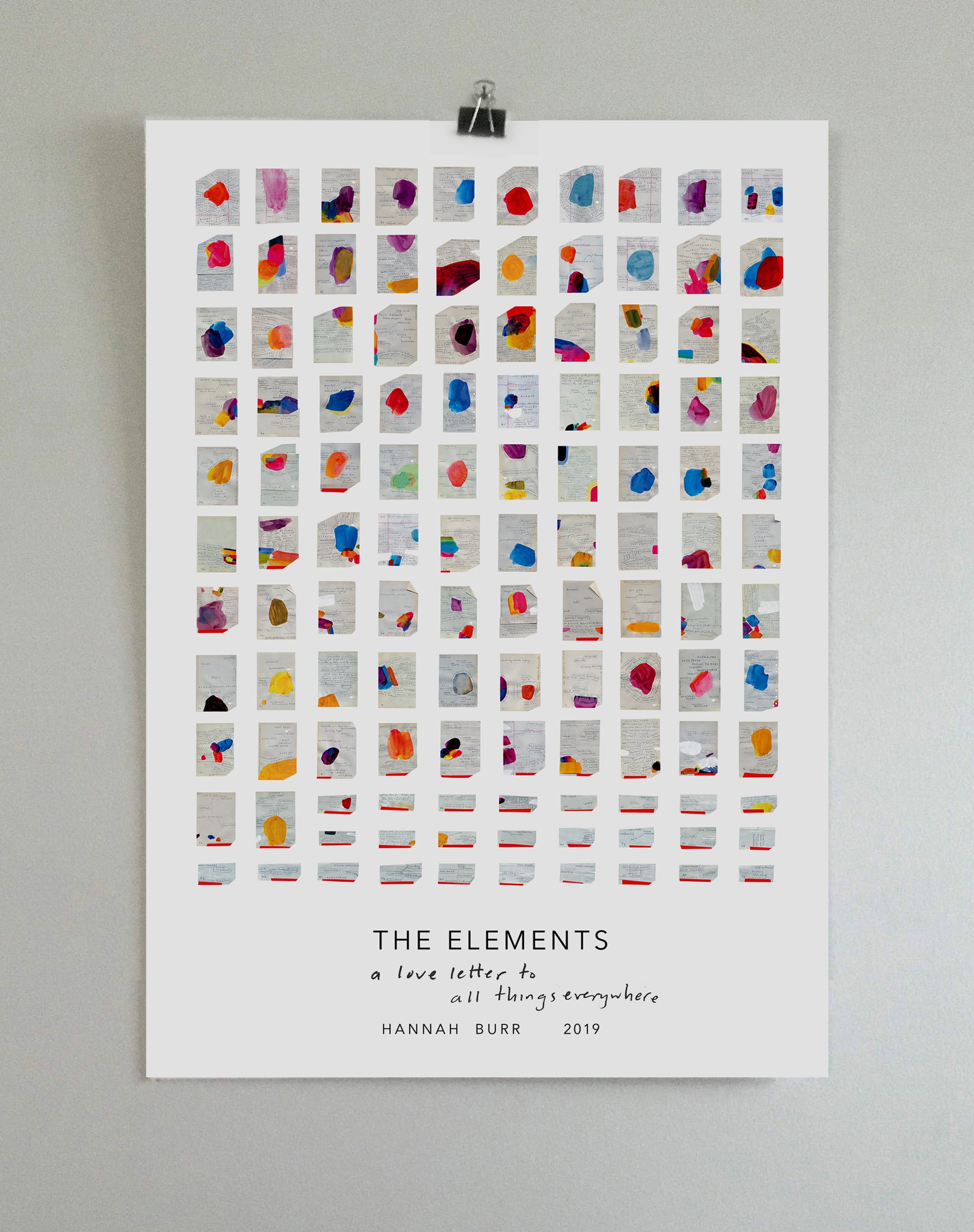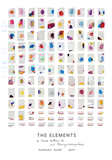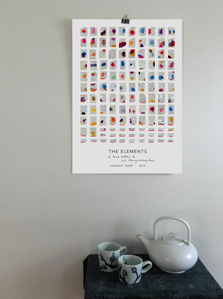 Every element sketch from the book Elements: a love letter to all things everywhere, is laid out grid style in this lovely poster. There are 118 element sketches. Each poster is hand signed and editioned, and designed by Hannah Burr. The poster is on 100# matte UV coated stock, and is 27 x 19"
